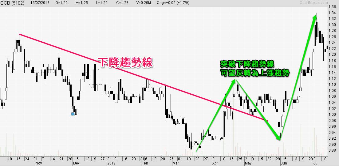 判断趋势的方法非常简单又直觉,当股价是沿着上升趋势线往上走,就是在上升趋势当中;反之,当股价是沿着下降趋势线往下走,就是在下跌的趋势之中。请看图一。